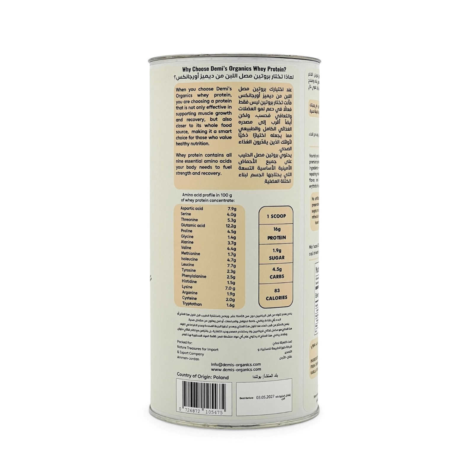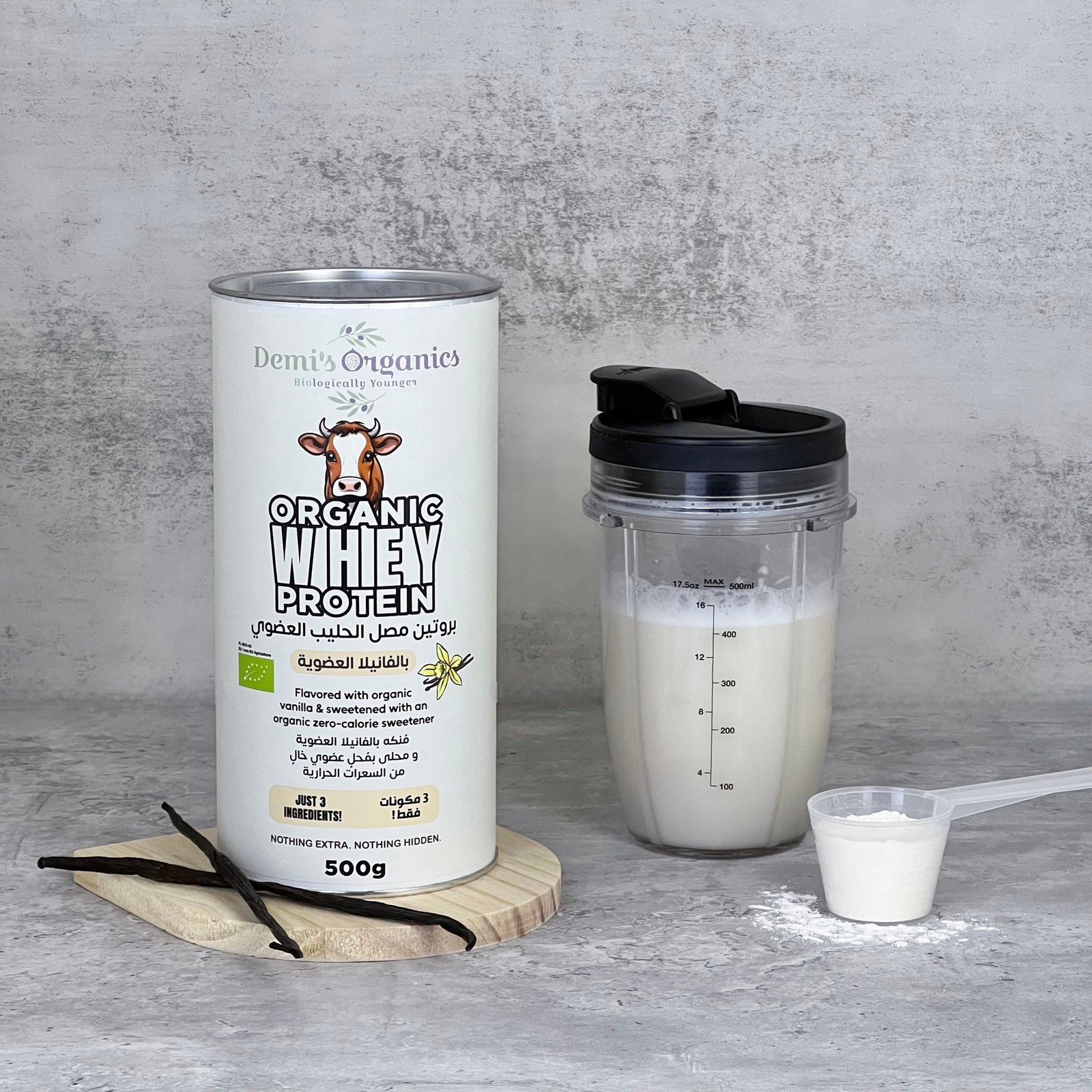 بروتين مصل الحليب العضوي بالفانيلا من ديميز أورجانكس… الخيار المثالي لمن يبحث عن البساطة والنظافة والفعالية والجودة في منتج واحد. ثلاث مكونات فقط بخلاف منتجات السوق التجارية التي تحتوي قائمة مكوناتها على أكثر من عشر مكونات غير مفهومة ومضرة بصحتنا.