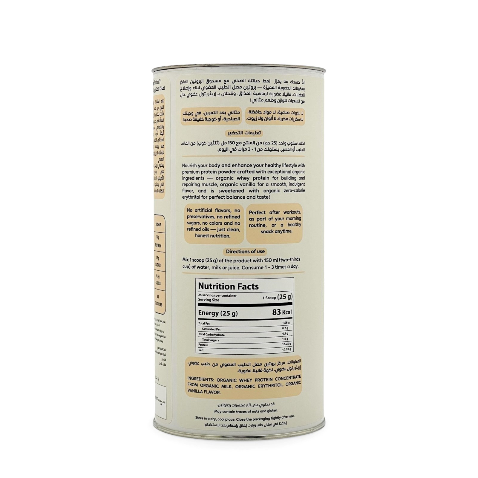 مركز بروتين مصل الحليب العضوي لدعم القوة واللياقة، فانيلا عضوية لرفاهية المذاق، ومُحلى بـ إريثريتول عضوي خالٍ من السعرات لتوازن مثالي دون أي شعور بالذنب. لا إضافات مخفية، لا مواد حافظة، لا محليات ضارة، لا زيوت ولا مكونات غريبة عجيبة — فقط ما يحتاجه جسدك ليستمد قوته من مصدر نظيف وصحي.