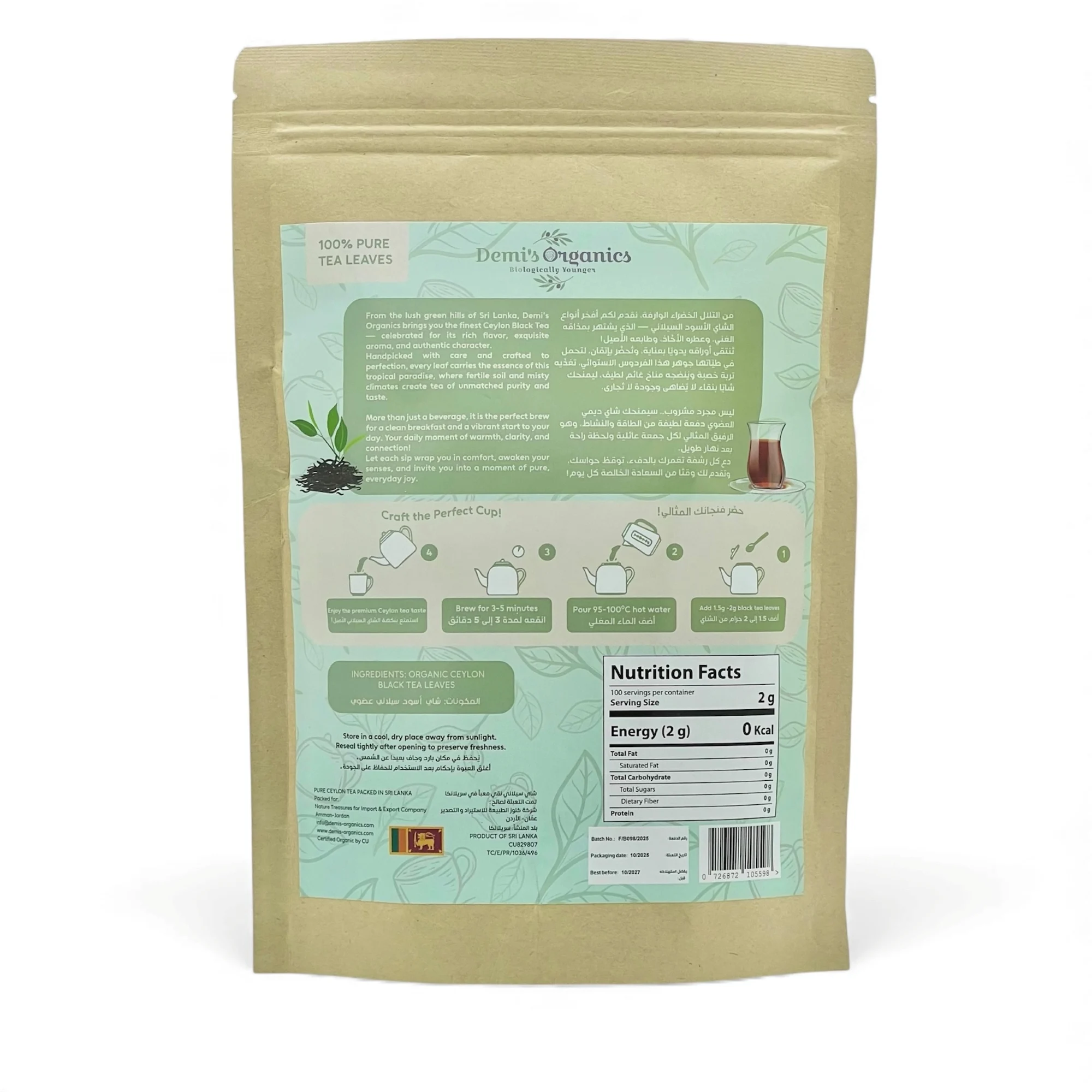 • شاي ديمي السيلاني العضوي يتكون من أوراق كاملة مقطّعة، مما يسمح بتوسعها أثناء التحضير، مما يطلق نكهات وروائح أكثر غنى.