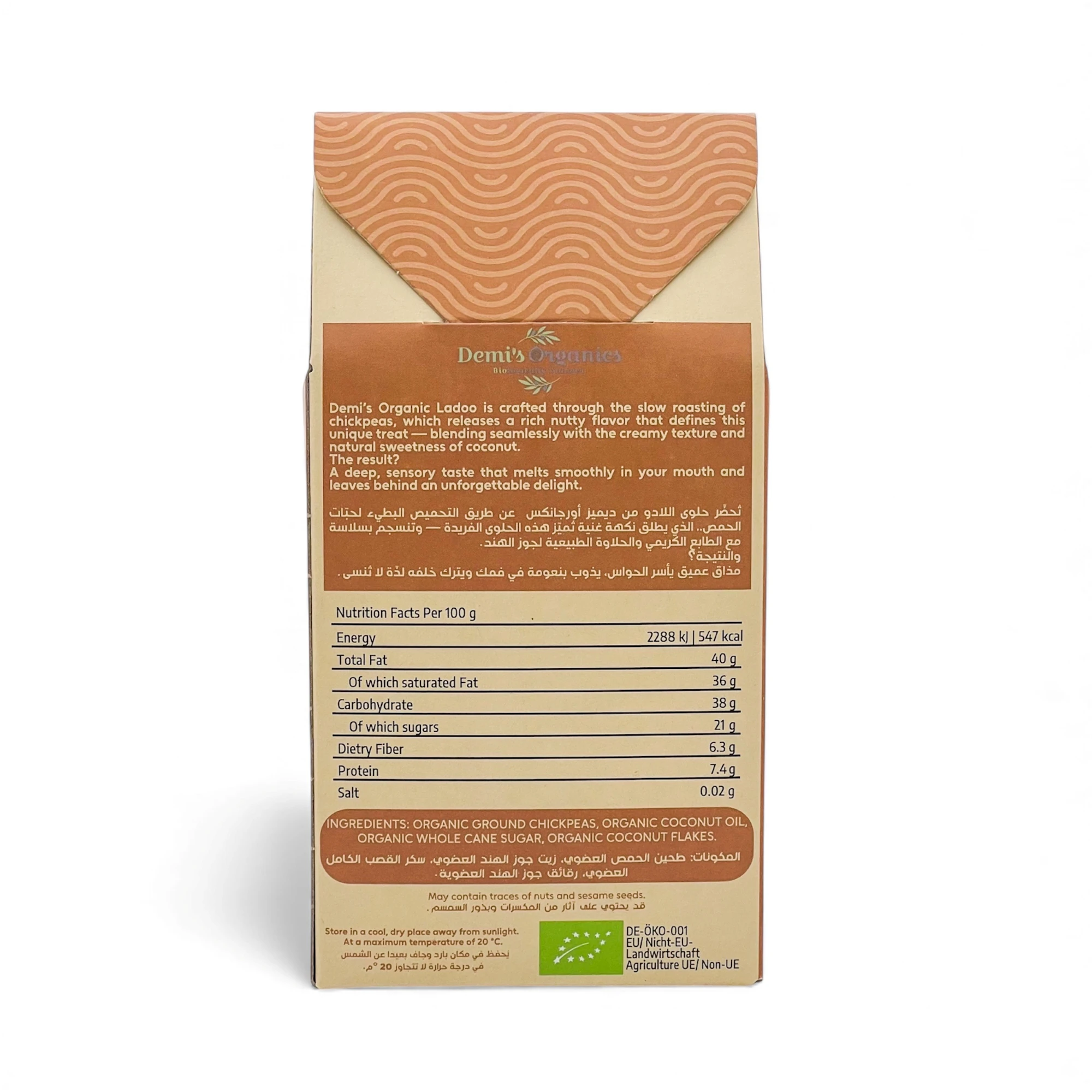 تُحضَّر حلوى اللادو من ديميز أورجانكس عن طريق التحميص البطيء لحبّات الحمص.. الذي يطلق نكهة غنية تُميّز هذه الحلوى الفريدة — وتنسجم بسلاسة مع الطابع الكريمي والحلاوة الطبيعية لجوز الهند.