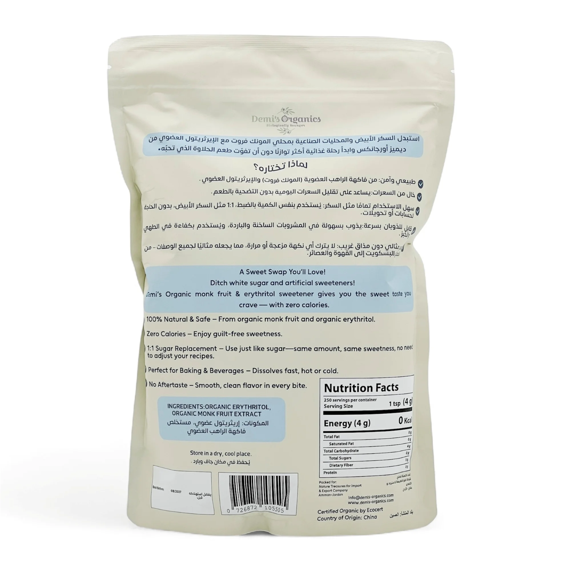 استمتع بمحلي المونك فروت والإريثريتول العضوي من ديميز أورجانكس كبديل طبيعي وصحي للسكر الأبيض.
